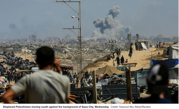 Displaced Palestinians moving south against the background of Gaza City, Wednesday. Credit: Dawoud Abu Alkas/Reuters. Published by Haaretz