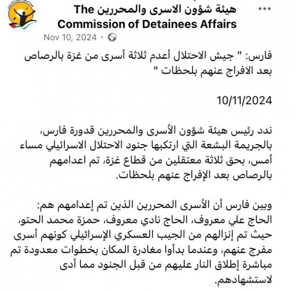 The Palestinian Commission of Detainees affairs posted on 10 Nov the details of their execution