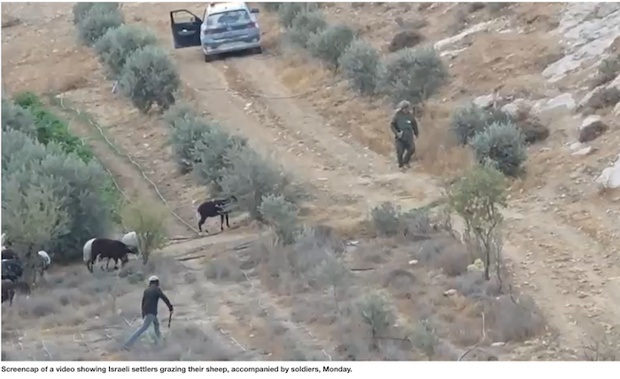 Screencap of a video showing Israeli settlers grazing their sheep, accompanied by soldiers, Monday.