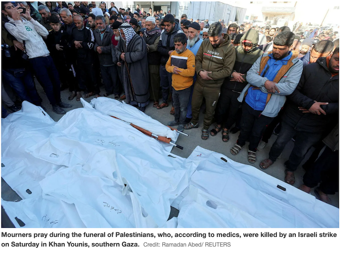 Mourners pray during the funeral of Palestinians, who, according to medics, were killed by an Israeli strike on Saturday in Khan Younis, southern Gaza. Credit: Ramadan Abed/ REUTERS. Published by Haaretz