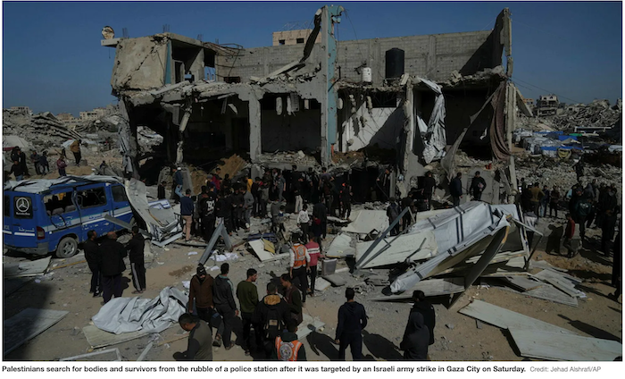 Palestinians search for bodies and survivors from the rubble of a police station after it was targeted by an Israeli army strike in Gaza City on Saturday. Credit: Jehad Alshrafi/AP. Published by Haaretz